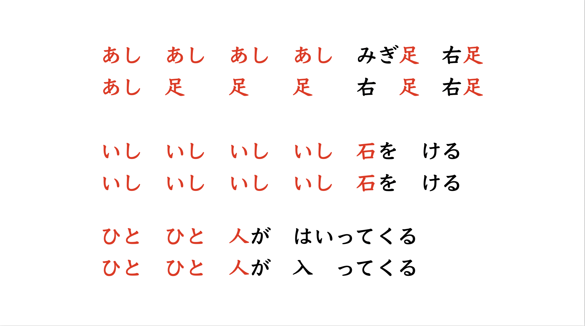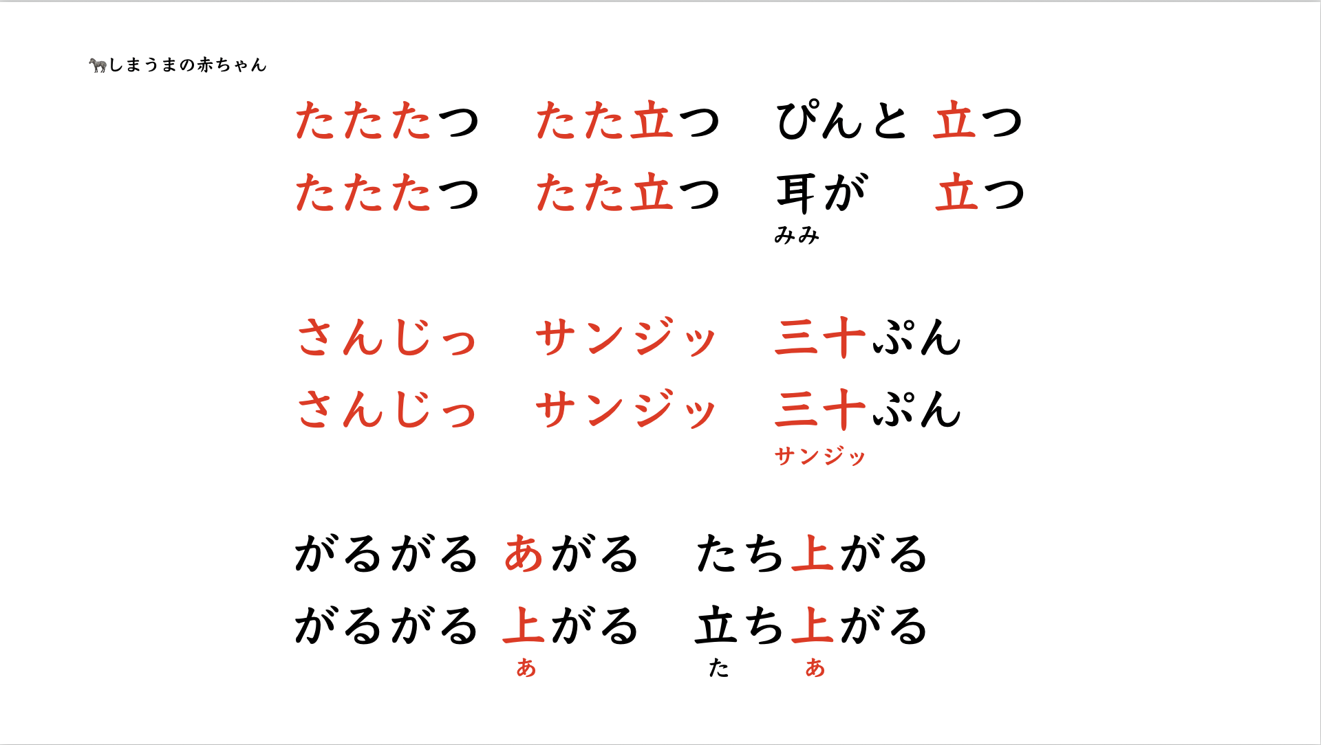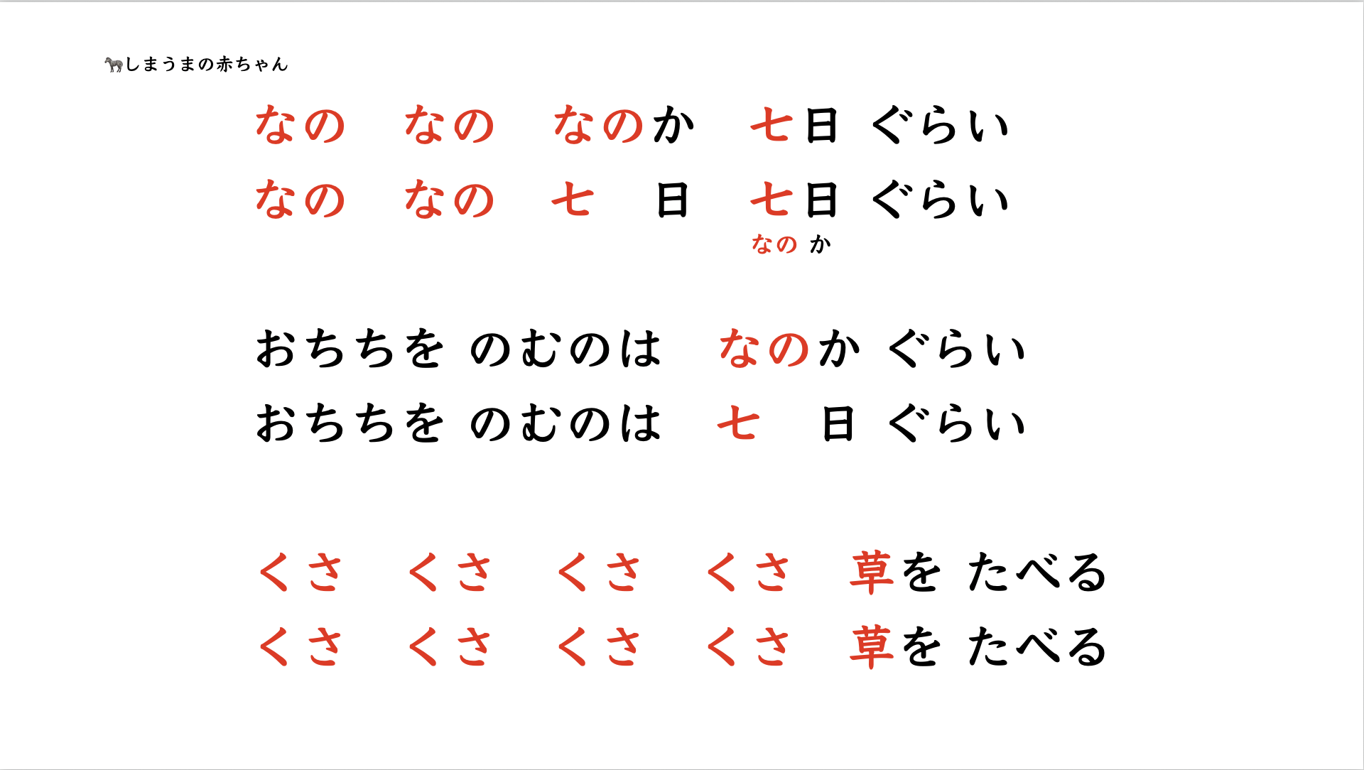 このページは既にリズム音読(4拍子)になっています。このまま2回ずつ読みましょう。一年生で習う漢字は、敢えて漢字にしています。