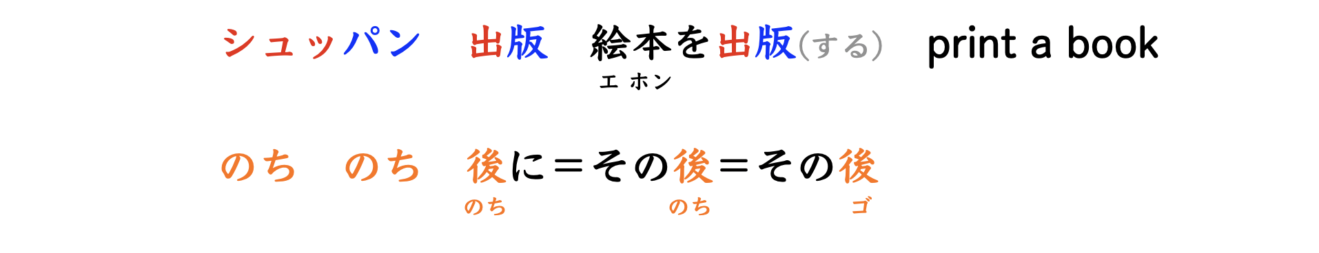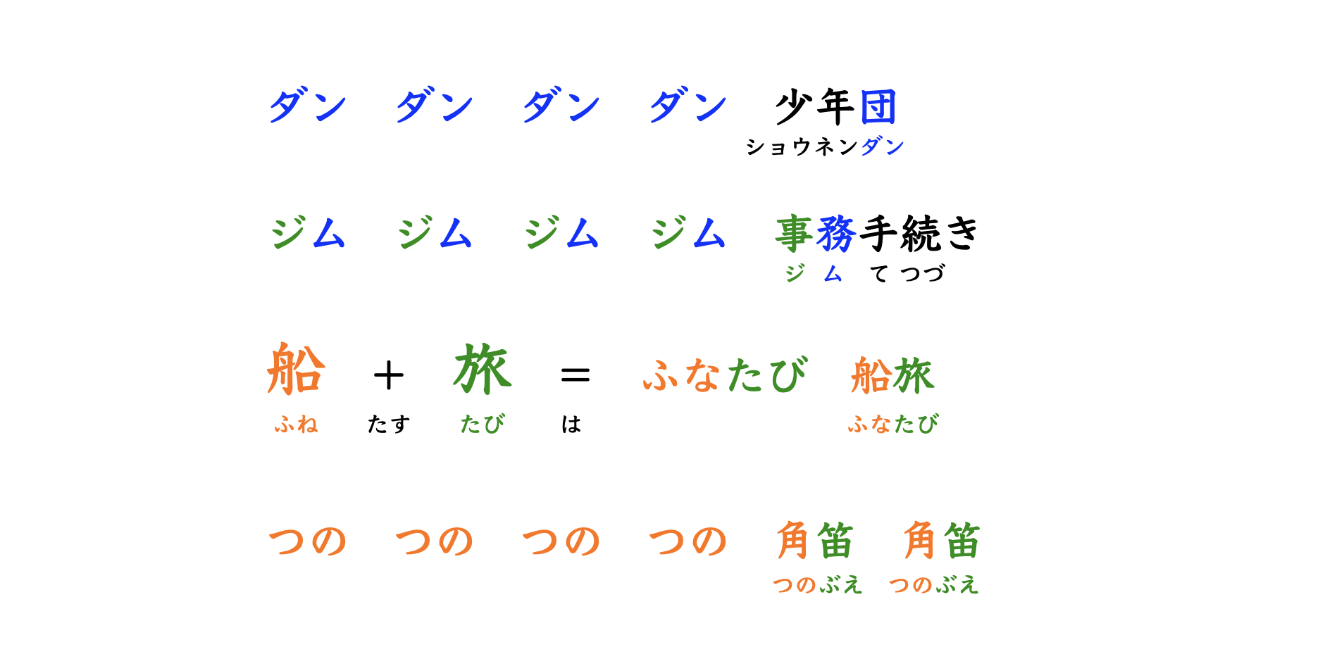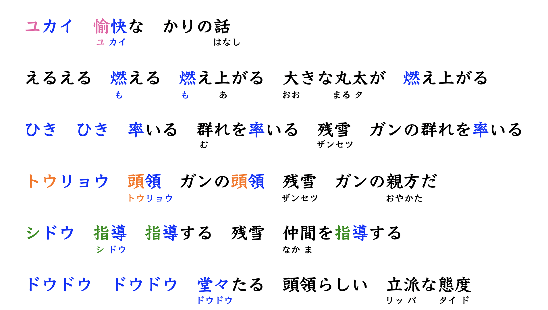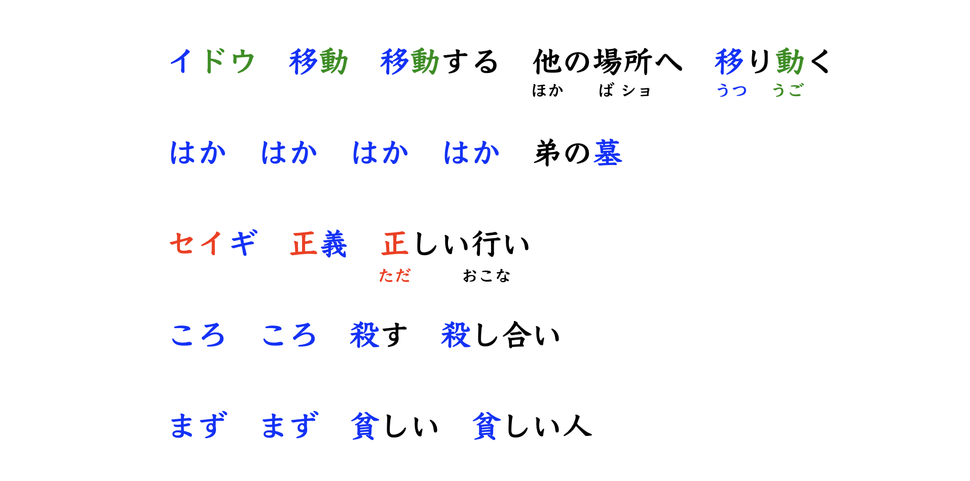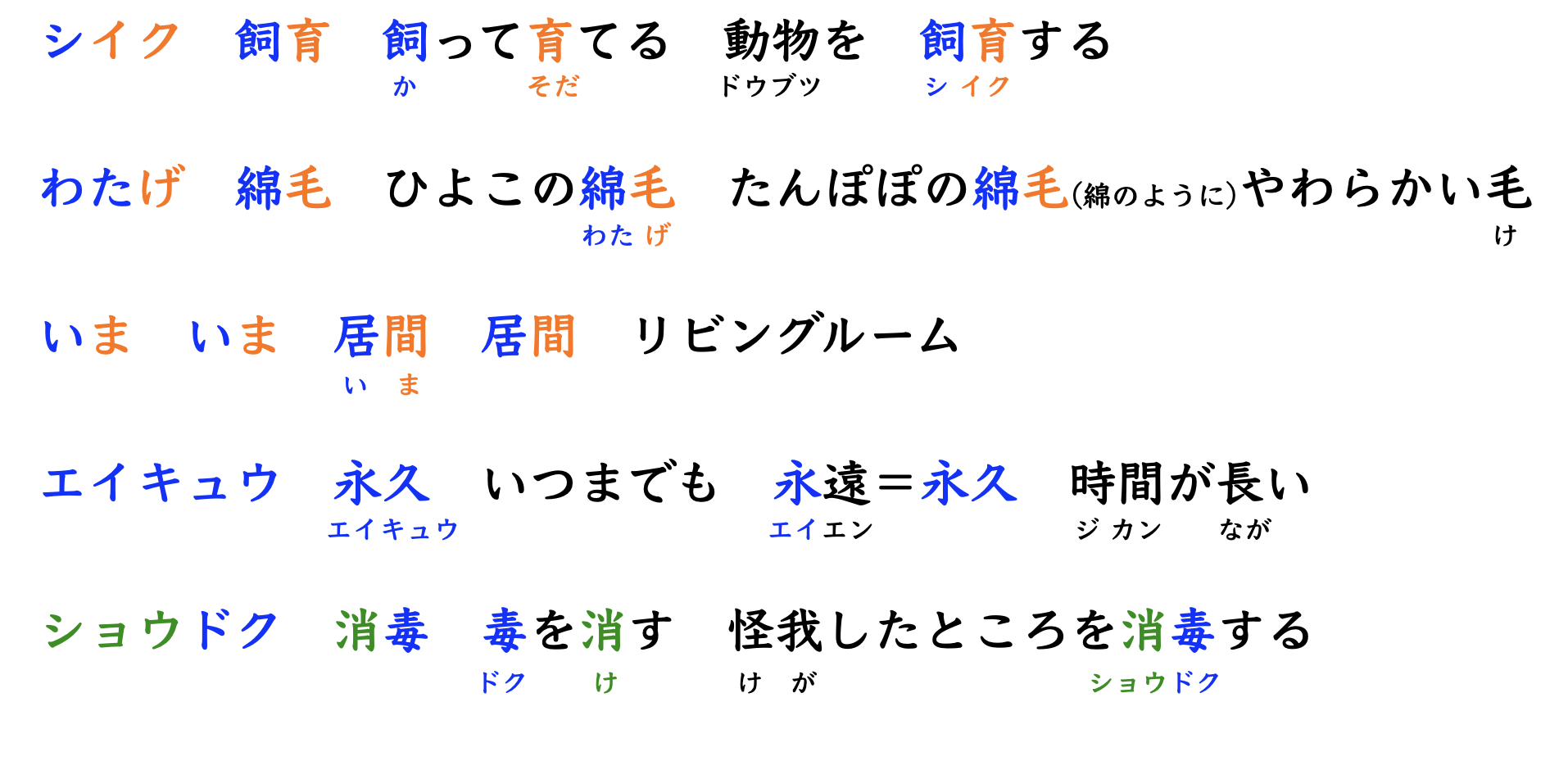 このページでは学習者の負担を軽減するため、全ての文に音訓読みの両方は入れていません(一部は入っています)。