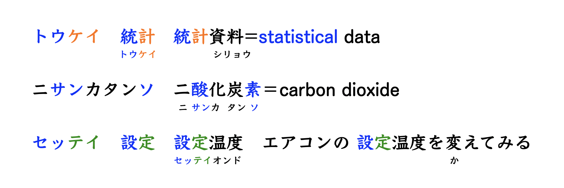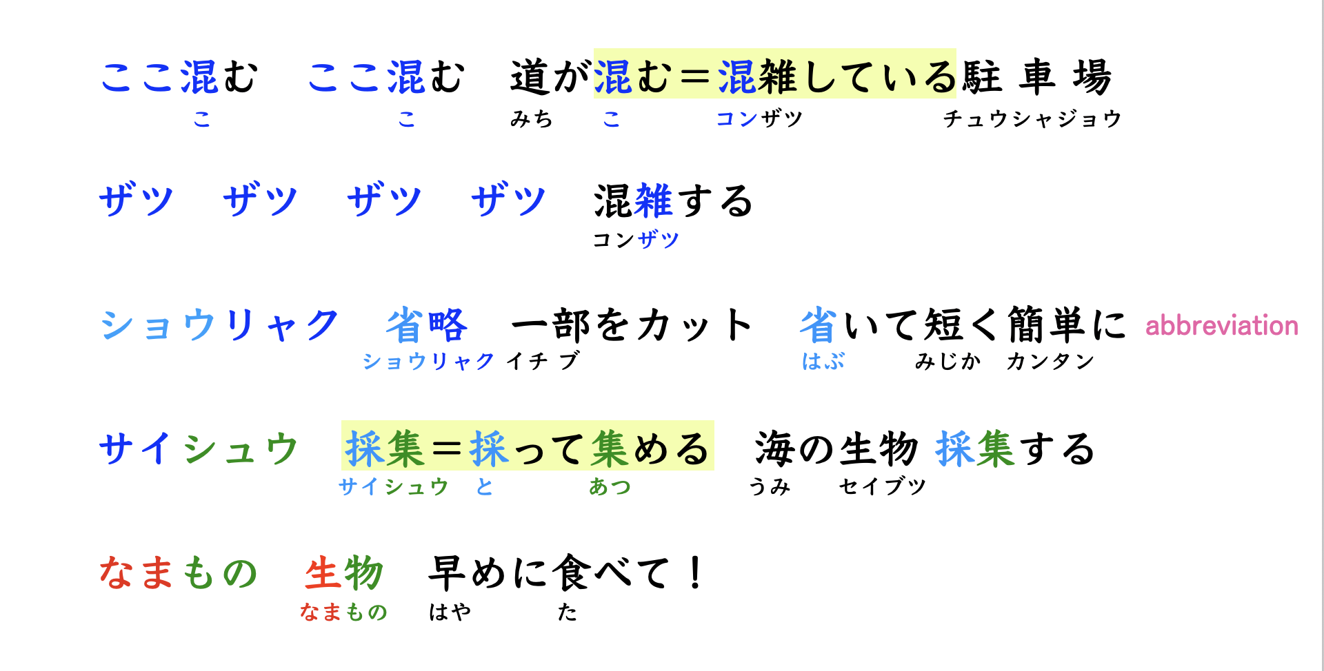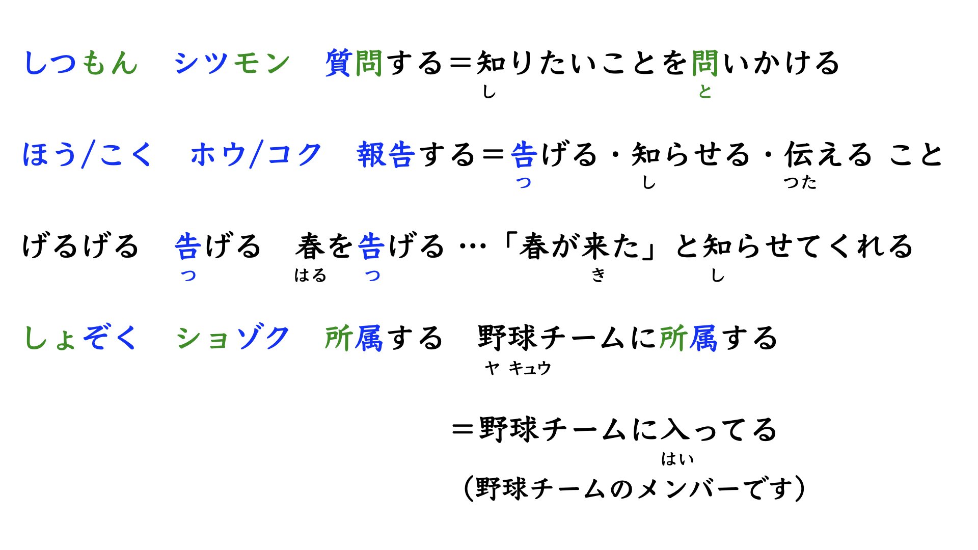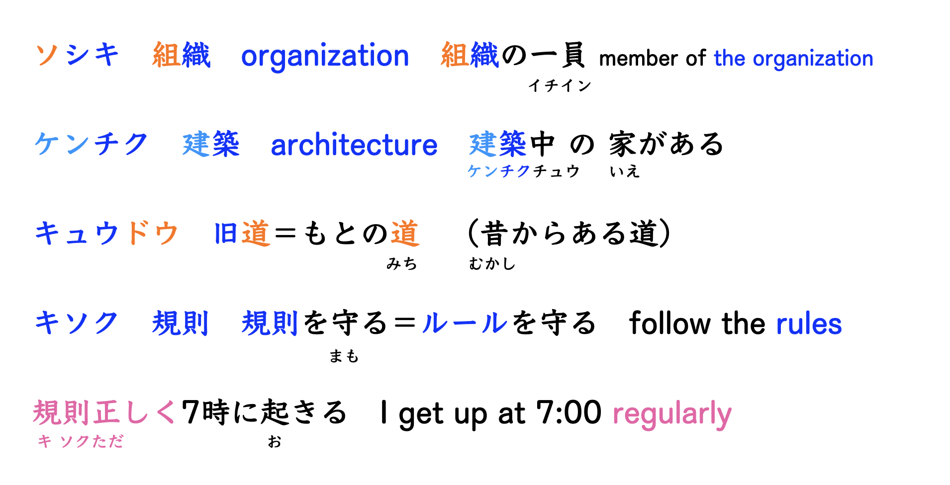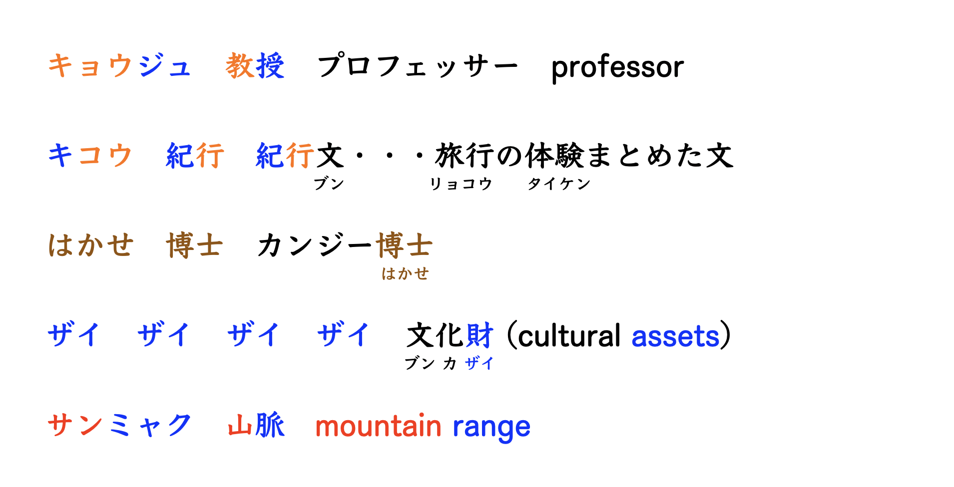 このページでは学習者の負担を軽減するため、全ての文に音訓読みの両方は入れていません(一部は入っています)。