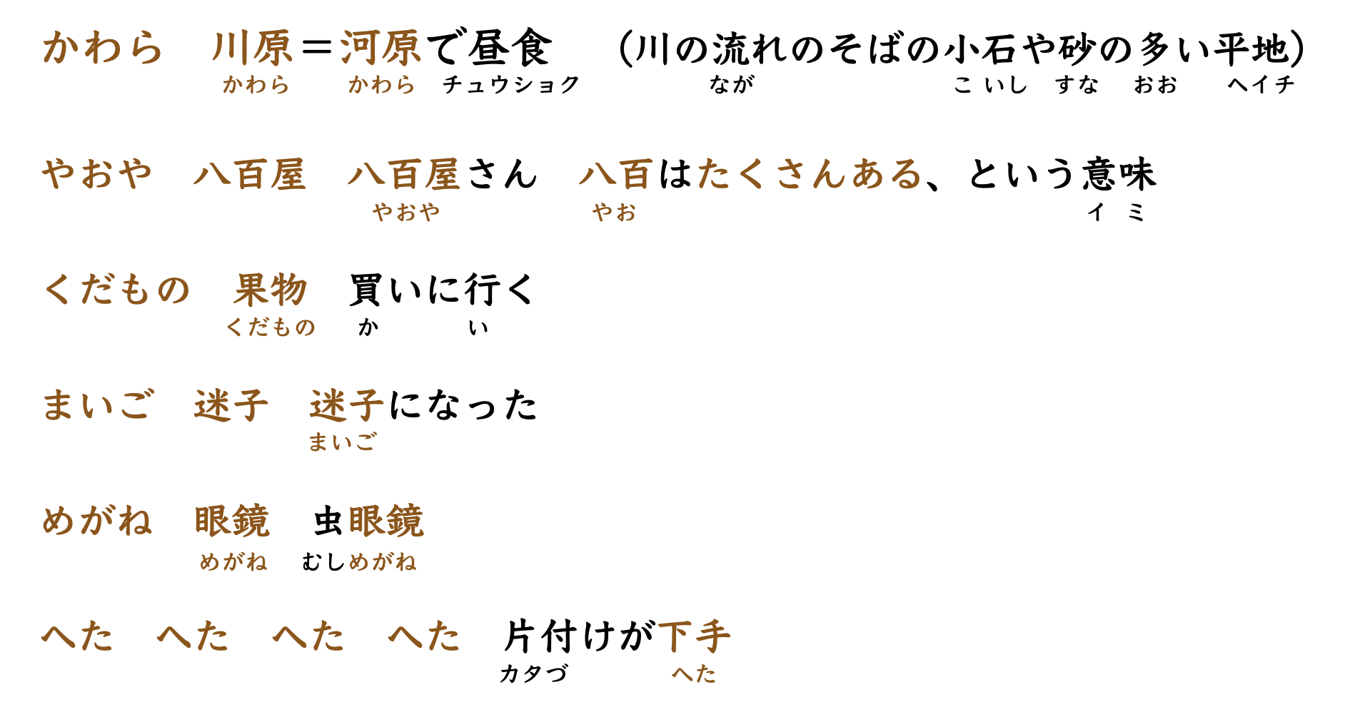 *今日、清水、八百屋、果物、眼鏡、下手は熟字訓に分類されます