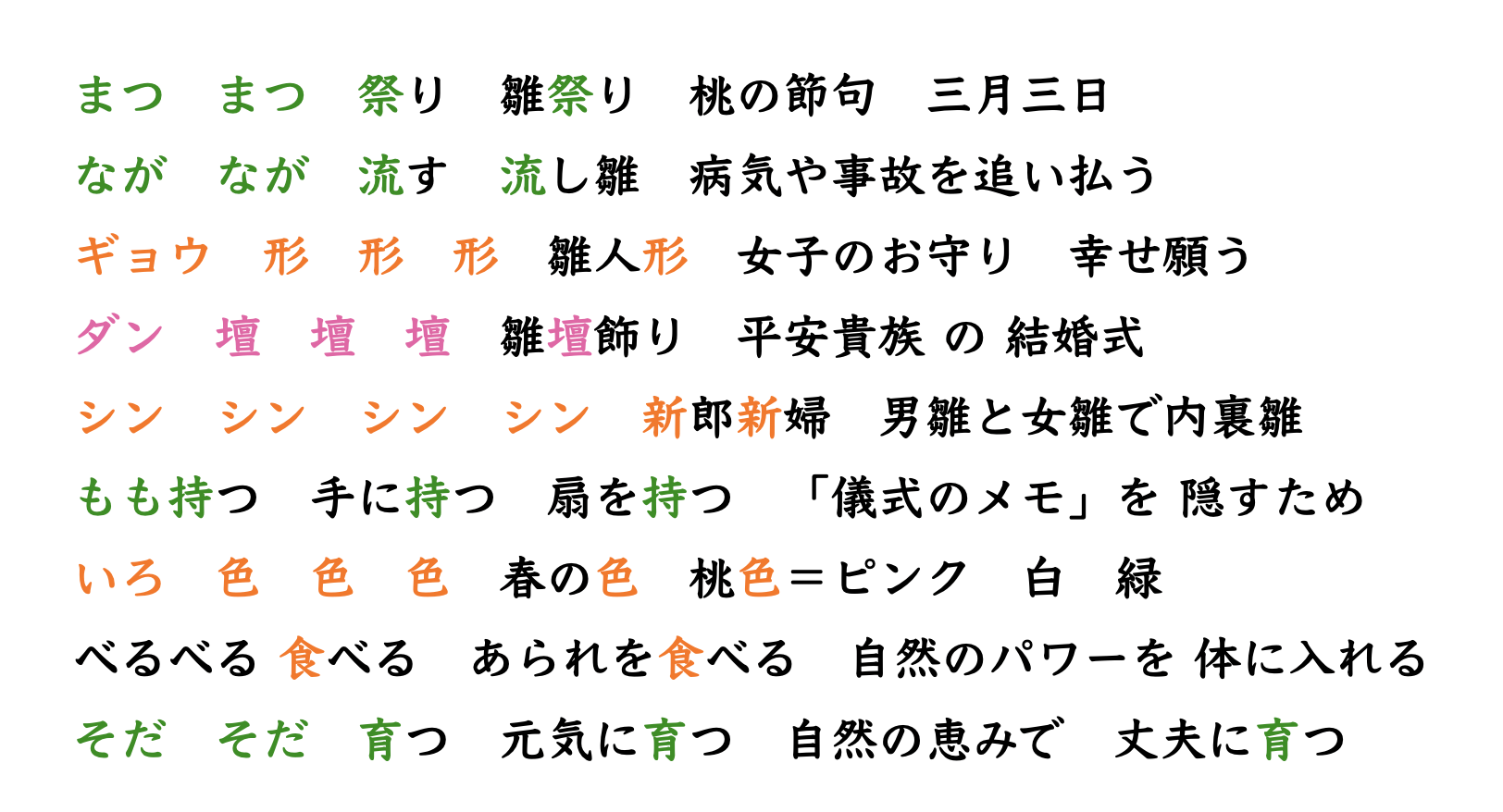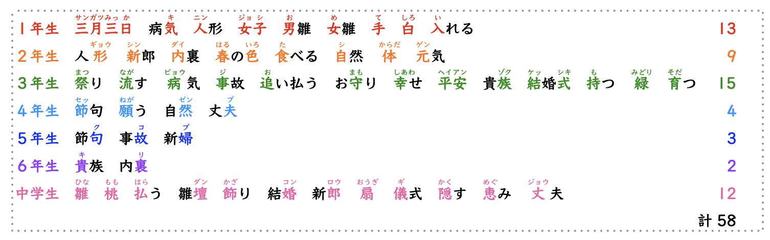 【ひな祭り】リズムで覚える漢字58字!お雛様は結婚式だった!? 行事で漢字を学ぶ X Facebook はてブ LINE 2026.02.27 ひな祭りの時期ですね!🌸 あの華やかな「ひな壇」の正体、 実はあまり知られていないんです。 単なる飾りではなく、 「ある儀式」を再現しているその正体とは…? 詳しくはこちらのブログをご覧になってくださいね。かなり詳しくクイズもあります。 ここでは上記のブログをもっと簡潔にまとめています。(1分で学べます) ショート動画の原稿を載せていますので、何度も繰り返し見ながら学習していただければと思います。 ショート動画で学べる漢字