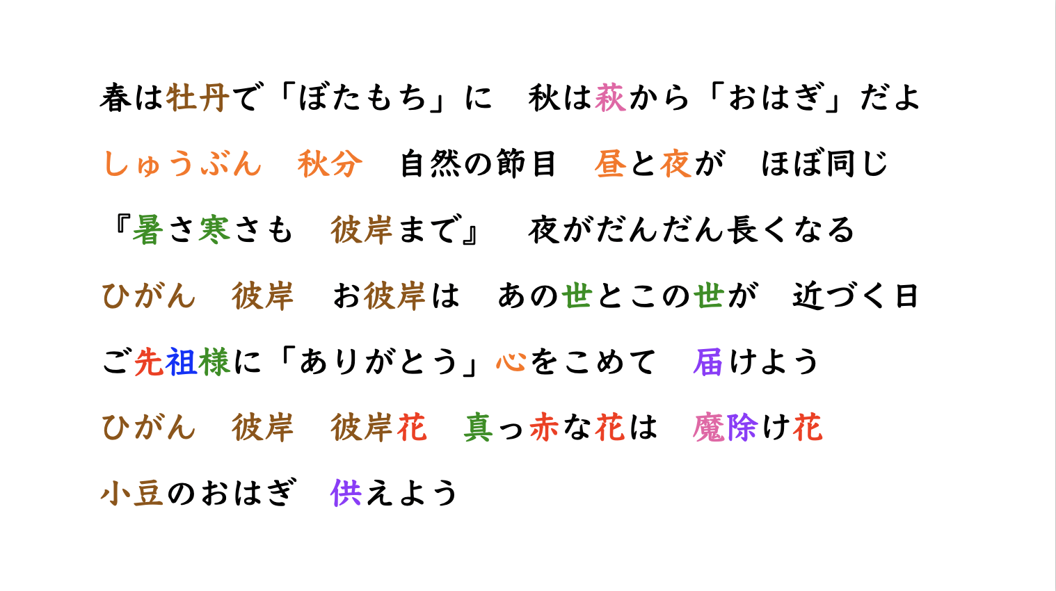 昼と夜がほぼ半分になる日ですが、秋分の日はお彼岸(おひがん)とも言います。春と秋の年に2回ある、ご先祖様との特別な日です。